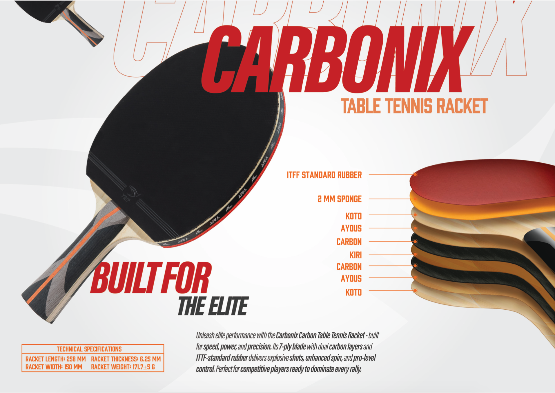 The Carbonix features a 7-ply blade made from premium Koto, Ayous and Kiri woods, reinforced with dual carbon layers and ITTF-approved rubber for pro-level play.
