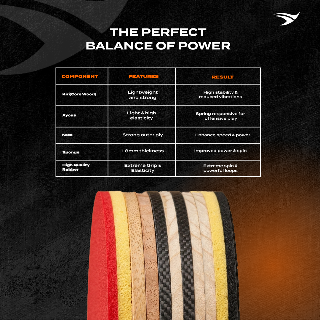 - 7-PLY WOOD BLADE CONSTRUCTION: Crafted with premium Koto, Ayous, and Kiri woods for ideal stiffness and responsiveness, tailored for competitive, high-speed play.