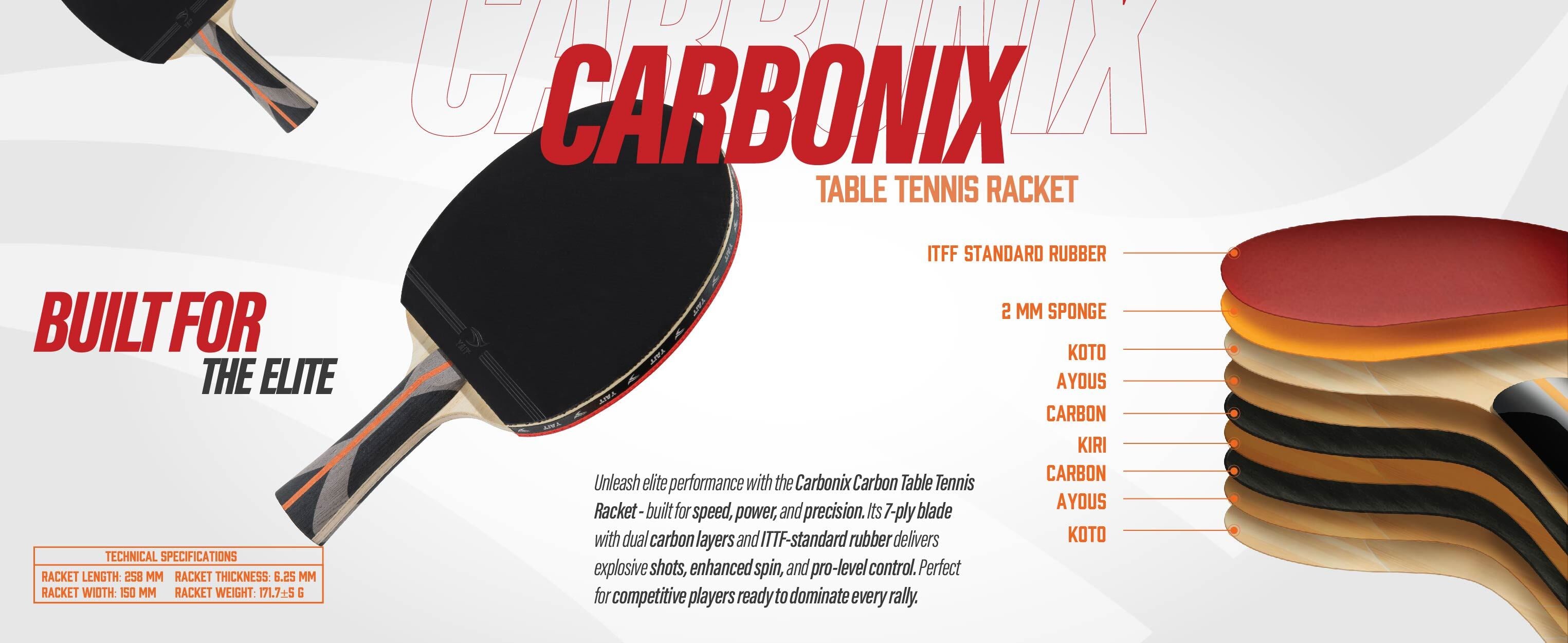 The Carbonix features a 7-ply blade made from premium Koto, Ayous and Kiri woods, reinforced with dual carbon layers and ITTF-approved rubber for pro-level play.