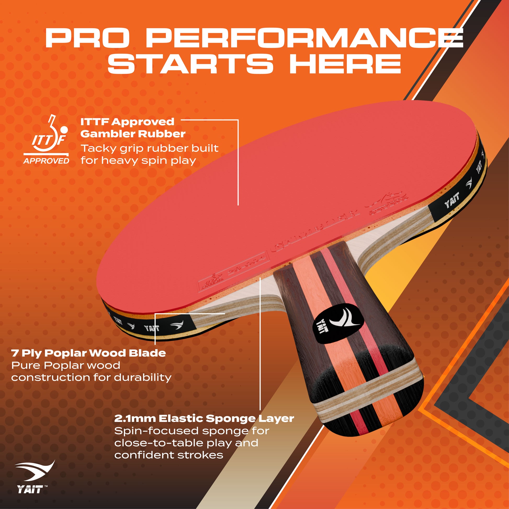 The YAIT Rally Pro Table Tennis Set is engineered for players who rely on spin to control the game. Featuring two high-performance rackets and four durable ABS balls, this set is perfect for both recreational and competitive play.Each racket comes equipped with ITTF-approved Gambler 7S rubber with a 2.1mm sponge, designed to generate heavy spin with controlled speed. The advanced tacky surface, combining 60% sticky and 40% mechanical grip, enhances friction for powerful spin shots and precise placement.The 7 ply pure poplar wood blade ensures durability and a stable feel, while supporting quick, compact strokes near the table. Whether you're serving, looping or rallying, the paddle delivers excellent spin control with balanced performance.If spin is your game, Rally Pro is built for you.
