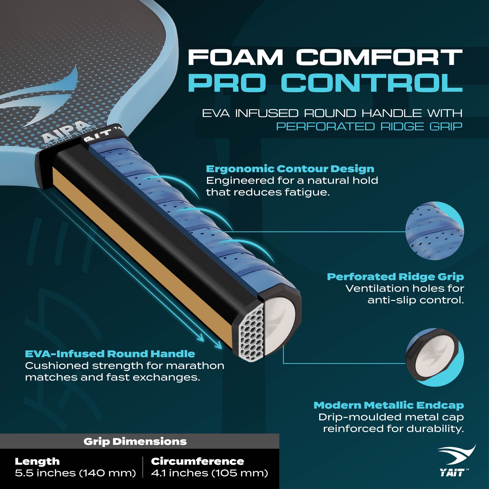 Wave-textured round handle with extra EVA foam underlay ensures a secure, comfortable hold during fast exchanges and long matches. - ENHANCED EDGE GUARD & METAL END CAP: