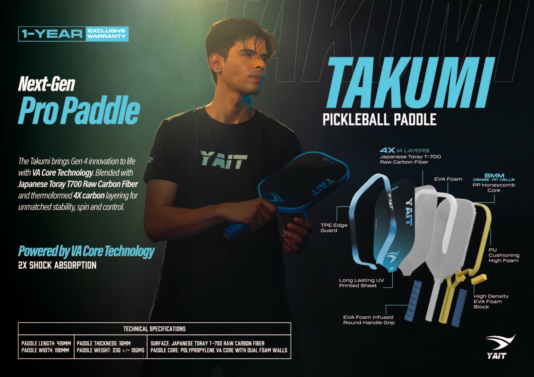 A thoughtfully engineered wave-contoured handle, finished with moisture-wicking grip material and cushioned EVA foam, provides long-lasting comfort in demanding rallies. Finished with an upgraded edge guard and a sleek metal end cap, Takumi is a statement of modern design and high-level performance.